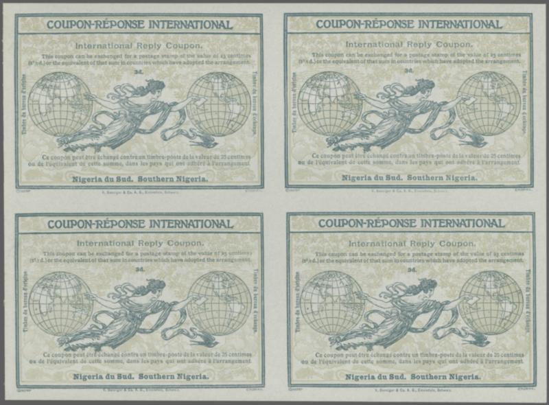 International Reply Coupon 1912: Rome type IV, 3 d. green-blue & pale-olive, imperforate Proof block of four, large margins all round, printed by V. Benziger & Co. Switzerland, fresh vibrant colour. The reverse has instructions in four language and states: "This coupon can be exchanged for a