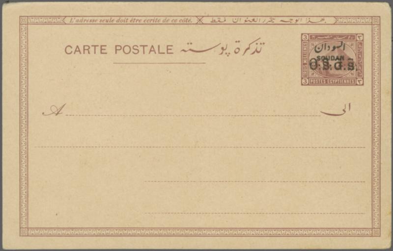 Egypt Stationery 1906: 3 m. brown Official post card, overprinted "SOUDAN" in Arabic and French and "O.S.G.S." overprint type B (17 mm.), variety "O.S.G.S. double overprint", unused. Minor imperfections to edges of no significance. A fine and rare card; only known Official post card with double over