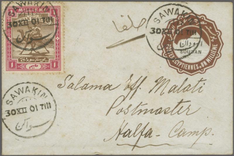 Egypt Stationery 1897: 1 m. brown envelope, overprinted in black with "SOUDAN" in Arabic and French, uprated with 1898 1 m. brown & pink, used from Sawakin to Halfa camp, dated 30 December 1901, cancelled by "SAWAKIN" circular datestamp in black, with an additional strike alongside. To the back