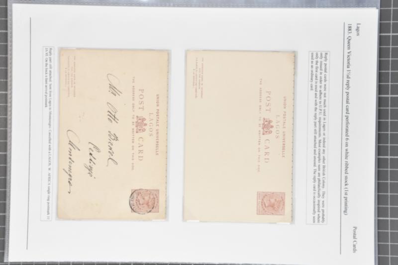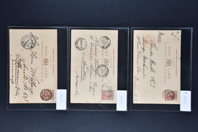 Nigeria (Lagos) Postal Stationery 1879–1911: An outstanding group of thirteen rare Lagos postal stationery items, including both used and unused examples, with several bearing manuscript “Specimen” or “Ultramar” overprints. Highlights include: 1879–1883 1½ d. cards (two archival Specimen examples, e