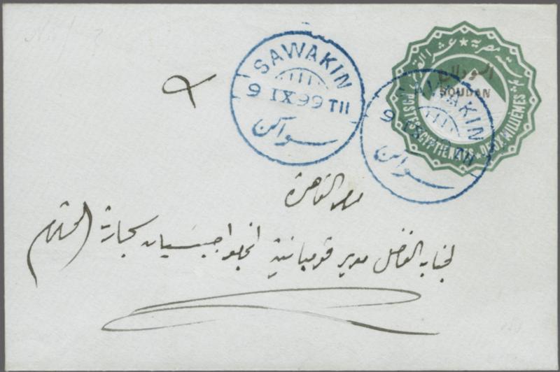 Egypt Stationery 1897: 2 m. green envelope, overprinted in black with "SOUDAN" in Arabic and French, used and addressed locally, dated 9 September 1899, cancelled by a blue "SAWAKIN" circular datestamp, with an additional strike alongside. A very clean and fresh example. Scarce usage; only 250 envel