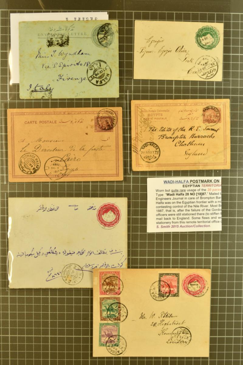 Egypt Stationery 1879/97: Group of five postal stationery examples used in Wadi Halfa, Sudan. Includes rare 20 p. light-brown postal card sent 28 November 1898 by Colonel Ironside to the Editor of the Royal Engineer Journal (has faults/damaged) to Chatham, Brompton Barracks. Also, 1893 5 m. envelope