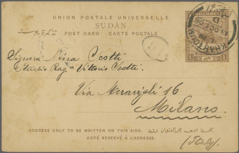Large Camel 1908: 4 m. brown, postal card, used from Khartoum to Milan, Italy, dated 13 October 1908, cancelled by a single circle datestamp in black. To the reverse an entensive message. Some stains, otherwise fine. A rare example; one of four recorded (H&G 13)