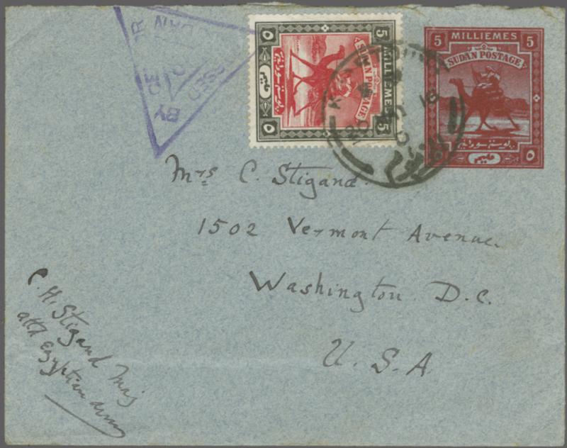 Large Camel 1913: 5 m. deep carmine on blue paper envelope, used with 1902/21 5 m. scarlet & black, sent from Khartoum to Washington, USA, dated 20 May 1916, tied by "KHARTOUM" single circle datestamp in black, with triangular "PASSED BY CENSOR SUDAN / 8" in violet alongside. Endorsed "C.H. Stig