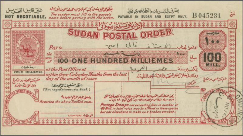 Postal Orders 1940: Camel 100 m. red with 100 m. poundage issued at Omdurman 8 November 1943, with instructions to reverse amended by violet handstamp. Has been vertically folded centrally, otherwise in fine condition. Also a £E1 "One Egyptian Pound" postal order with 10 m. poundage unissued. T