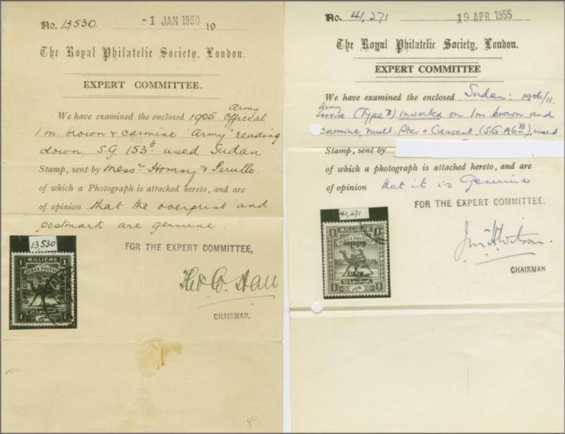 Army Officials 1905–06: Group of 3 (all with certificates), comprising; 1905 (Jan) 1 m. brown & carmine, ARMY reading down (A2) with variety “Dropped O”, used at Wadi Halfa Camp (BPA 2012, Gi £800); 1906 (Jan) 1 m. brown & carmine with A3 overprint type A, 14 mm. spacing, wmk Multiple S