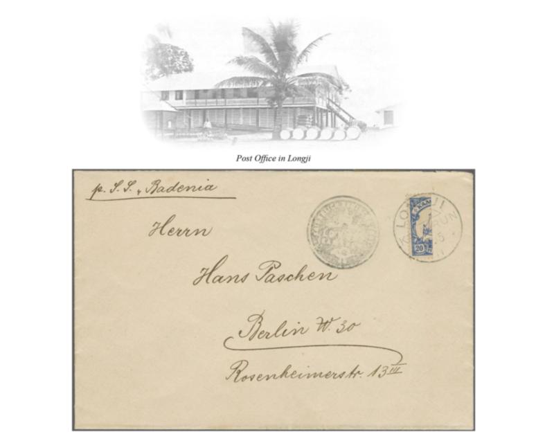 Longji Emergency Issue 1911: Kaiser's Yacht, 20 pf. ultramarine, vertical bisect, used on cover, from Longji to Berlin, dated 19 May 1911, tied by an upright strike of the "LONGJI / KAMERUN" circular datestamp in black, with "KAISERLICH DEUTSCHE POST / LONGJI / TOGO" circular intaglio seal alongside