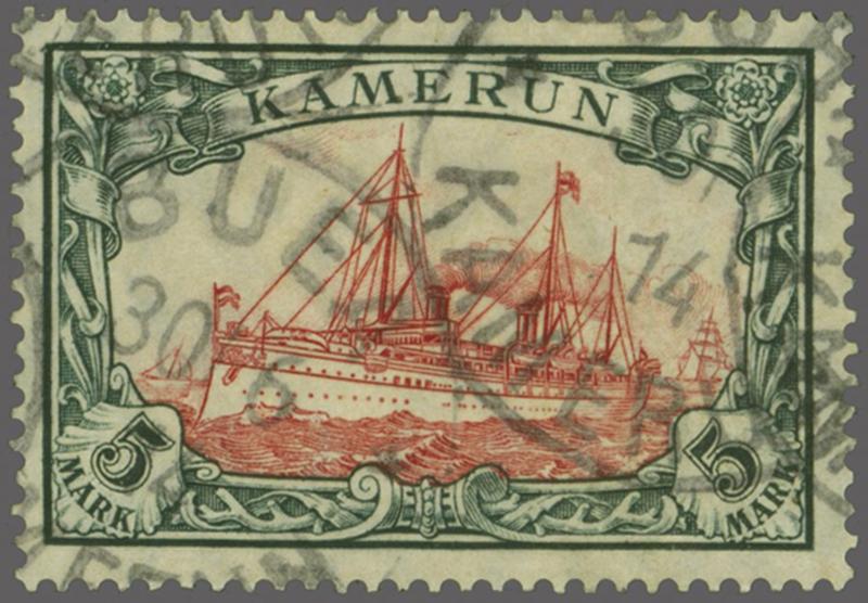 1913: Kaiser's Yacht 5 m. green, black & red, 26/17 perf., a used example, dated 30 June 1914, cancelled by a multiple strikes of the "BUEA / KAMERUN" circular datestamp in black, good colour, fine appearance. Scarce. Cert. Steuer (1993) Mi = € 4'800