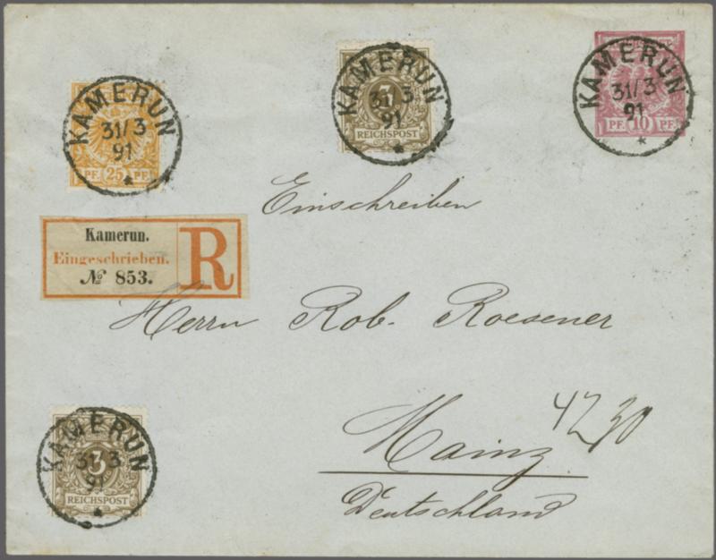 Forerunner Stationery 1889: 10 pf. red envelope (147 x 115 mm.) uprated with two 1889 3 pf. brown and a single 25 pf. orange, sent registered, from Kamerun to Mainz, dated 31 March 1891, cancelled by "KAMERUN" circular datestamp in black, with registration label "no.853" alongside. To the reverse an