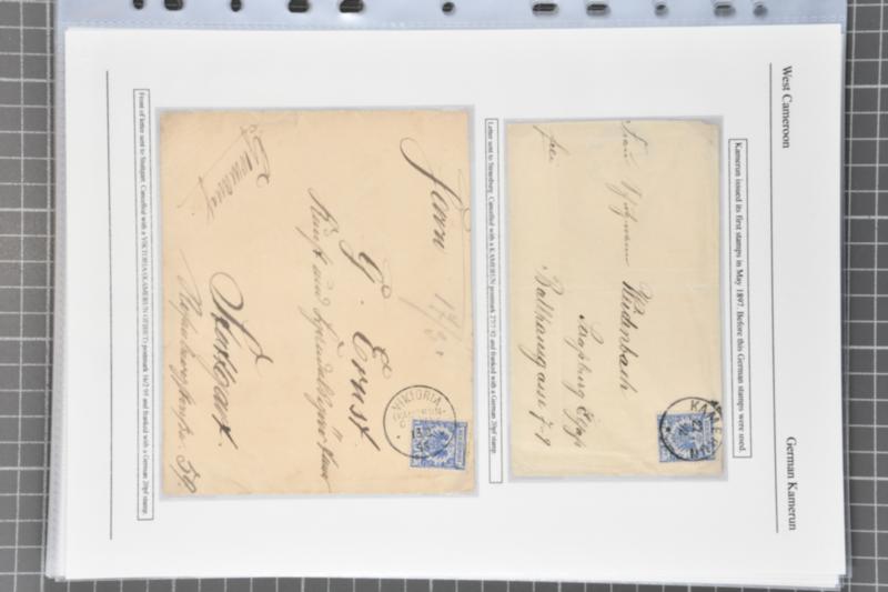 1892-1915: Lot mit 15 Belegen, teils aufgezogen auf Blättern mit Vorläufern und besseren Stempeln, 5-Mark-Marke ohne WZ auf etwas fleckigem R-Brief (Mi 19), sowie eine philatelistisch motivierte Halbierung der 20-Pfennig-Marke mit Stempel BUEA