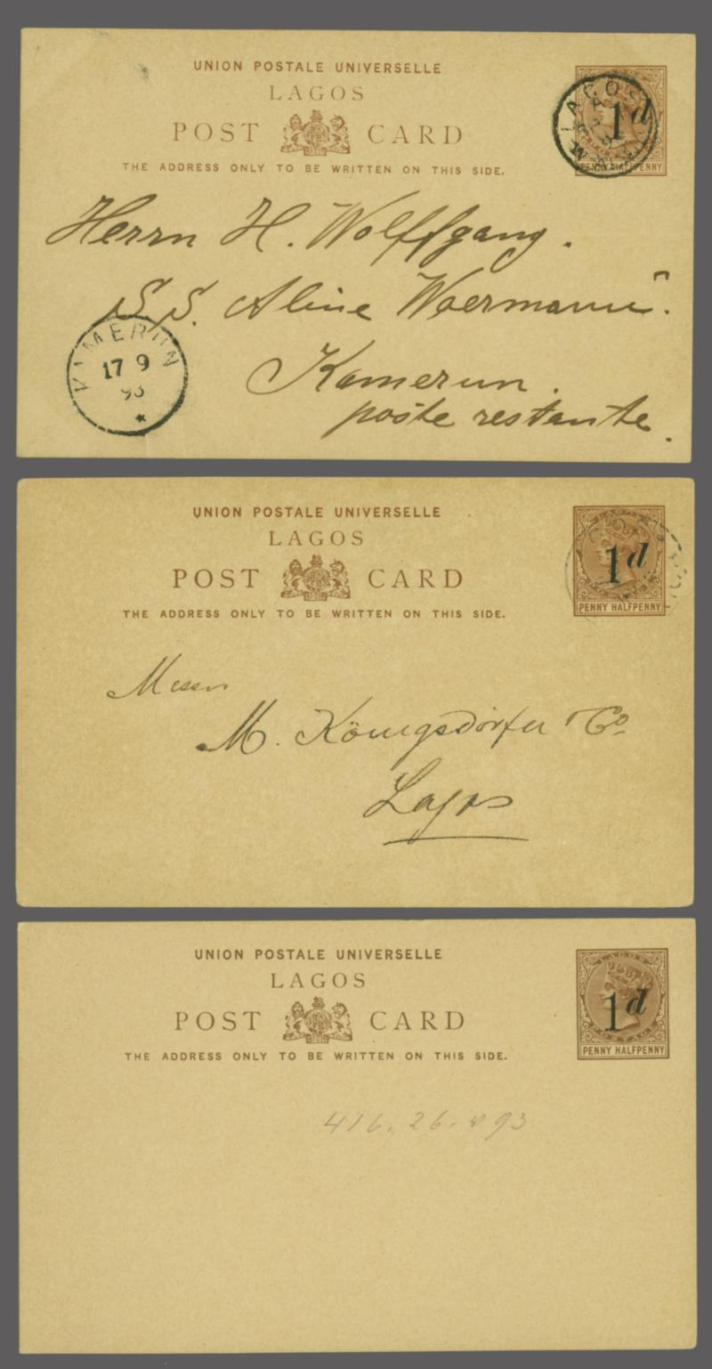 Group of sixteen stationery cards. Comprising six 1893 1 d. carmine used to various destinations, including Austria, German and England. Two used internally. Also six Lagos 1902 1 d. cards and three 1907 Southern Nigeria 1 d. cards. Of which six are used and two unused; the latter are an example of