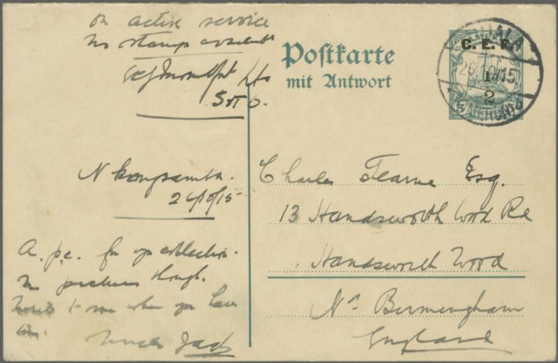 British Occupation 1915: 5+5 pf. green, reply postal card (reply part attached unused), overprinted "C.E.F" and surcharged "½d" in black, variety 'Short "1" in fraction' (in both cases), watermark DR 1., used from Duala to Birmingham, England dated 26 October 1915, endorsed "On Active Service / no s