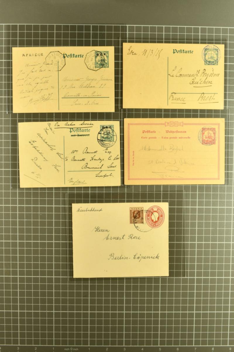 Cameroons – British & French Occupation Postal Stationery 1915-1930: An exceptional group of five examples, comprising both British and French Occupation issues: 1915 C.E.F. surcharged postal cards, including the 5 pf. green used to France with “AFRIQUE” ship mark (one of only two recorded) and