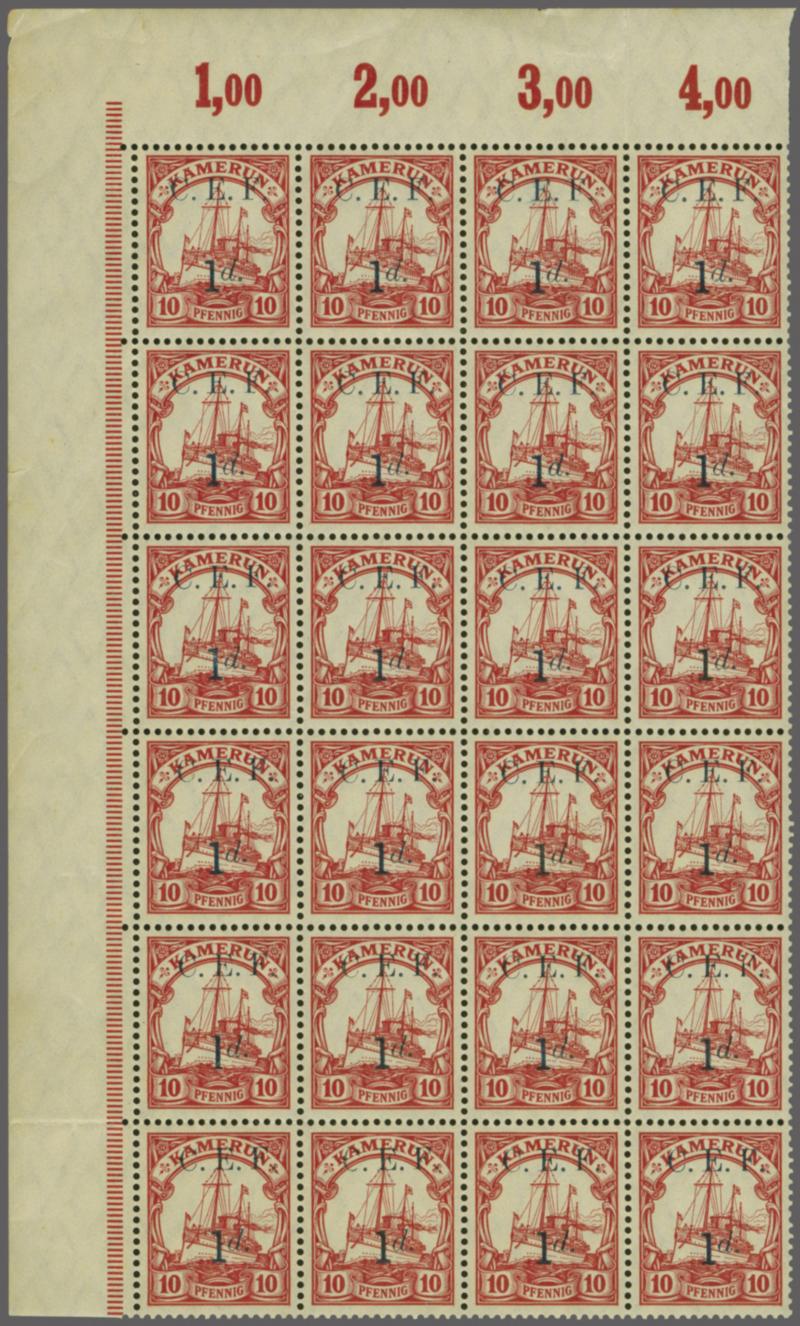 1915: 1 d. on 10 pf. black surcharge, corner marginal block of 24 stamps (4 x 6) from the upper left of the sheet. Unmounted with original gum, showing some offset printing on the gum side from the surcharge priting. The perforation is folded between the 3rd and 4th rows and between the 5th and 6th