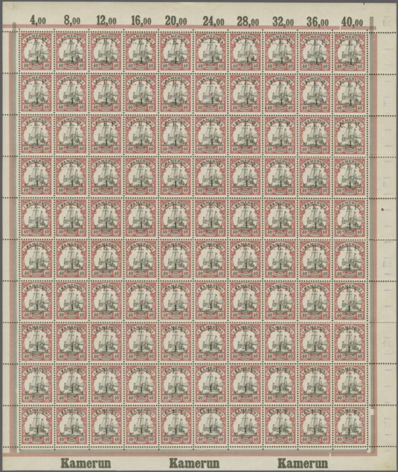 Cameroons Expeditionary Force: 1915: 40 pf. black & carmine, overprinted "C.E.F." and surcharged "4d" in black, a marginal sheet of one hundred (100), unused, original gum. All stamps never hinged, just small part of margin at top has tiny paper adhesion. Two stamps on the bottom row have the va