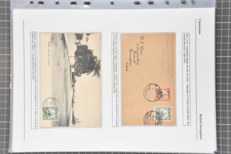 1915: Part collection of the Anglo-French occupation of Cameroon, comprising 10 pieces. This includes a philatelic cover with 3d on 30pf and ½d on 5pf, addressed to England, and a picture postcard from Duala featuring a ½d on 5pf stamp on the front (uncirculated). There are three mixed frankings, co