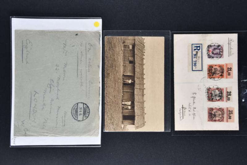 1915: Lot including a picture postcard from German Kamerun, franked with a ½ d. on 5 pf. colonial stamp and addressed to Lome, Togo, with an additional censor cancel. It also features three 'Blatter-covers', each differently franked with surcharged stamps: one with a 1 d. from Nigeria, another with