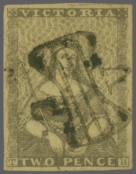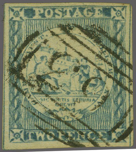 1850 (Jan 1): 2 d. greyish blue, Plate 1, no clouds, a used example with good to large margins, cancelled by "63" numeral obliterator of East Maitland Gi = £ 225