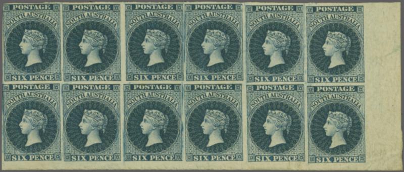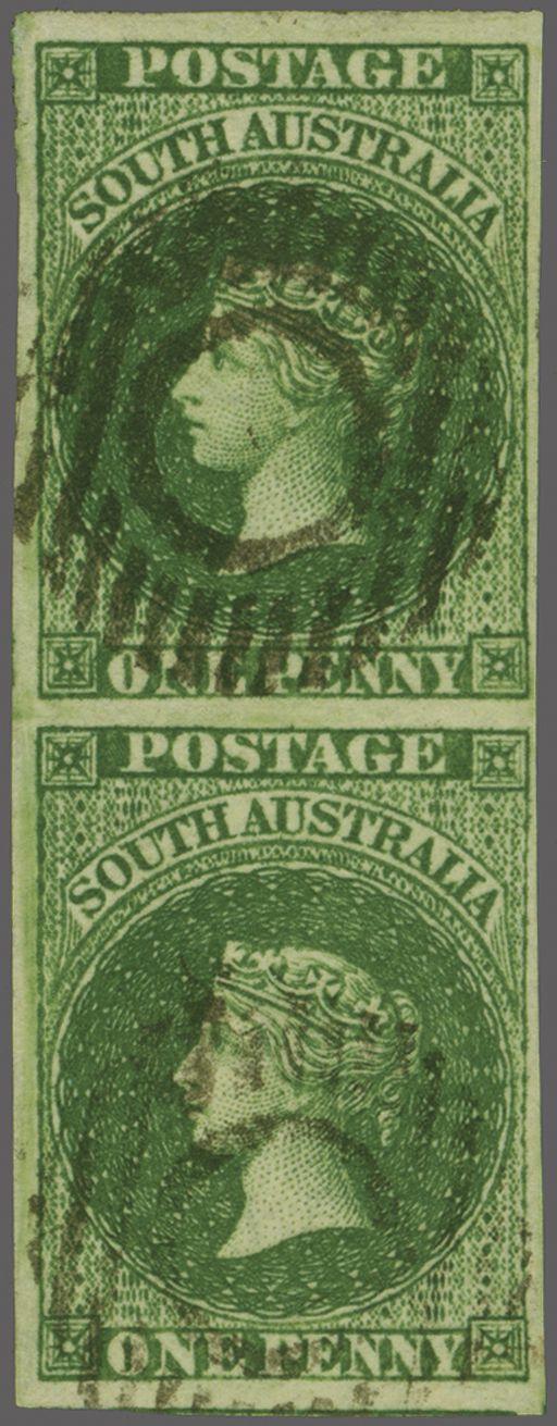 Recess by Perkins Bacon 1855: Perkins Bacon 1 d. dark green, wmk. Large Star, imperforate, a used vertical pair, clear to very fine margins and portion of adjoining stamp at base, lightly cancelled by Adelaide obliterators in black. A fine and scarce pair Gi = £ 1'000+. Provenance: Prestige, Me