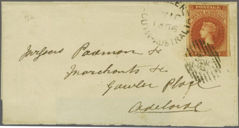 1855: Perkins Bacon 2 d. rose-carmine, a superb example of rich colour with large margins all round and portion of adjoining stamp at right, used on 1856 cover to Gawler Place, Adelaide tied in black by obliterator and "GAWLER / SOUTH AUSTRALIA" datestamp (May 16). Reverse, one side flap missing, wi