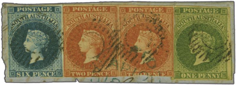 1855: Perkins Bacon 6 d. deep blue, 1856/58 Adelaide printing 1 d. deep yellow-green and 2 d. red in a horizontal pair, margins touched to large with the 1 d. very fine with portion of adjoining stamp at right, all used on small piece cancelled in black with partial 'Paid' datestamp in blue (April 1