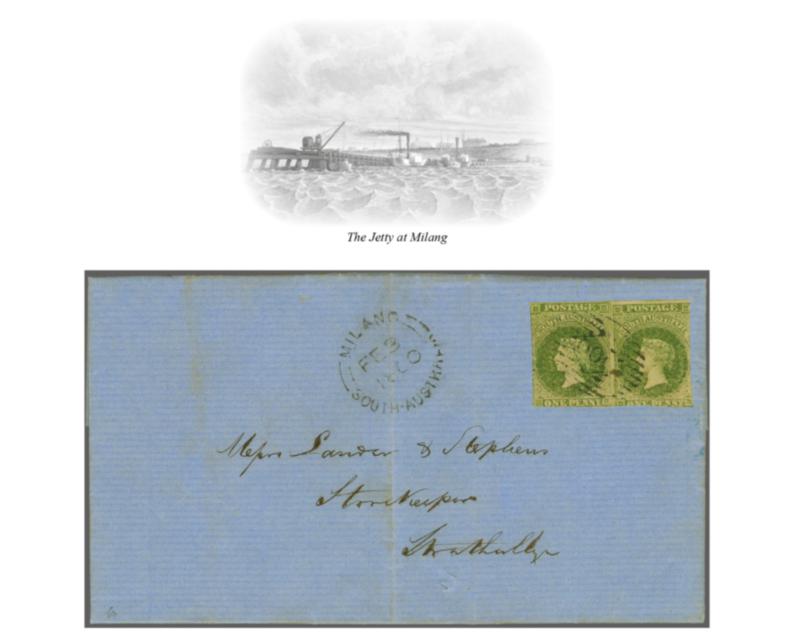 1856/58: Adelaide printing 1 d. yellow-green, a used horizontal pair on 1860 entire letter to Strathallyn cancelled by bold '100' numeral obliterator with "MILANG / SOUTH AUSTRALIA" datestamp at left (Feb 3) in black. Reverse with "Strathallyn" arrival cds (Feb 4) in blue. Tiny closed hole on front