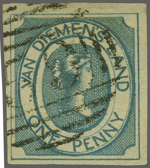1853: 1 d. blue, imperforate on medium soft yellowish paper, no. wmk., a used example with good to very large margins, early impression in a rich shade, cancelled by "59" numeral obliterator of Launceston in black. Choice and very fine Gi = £ 1'500