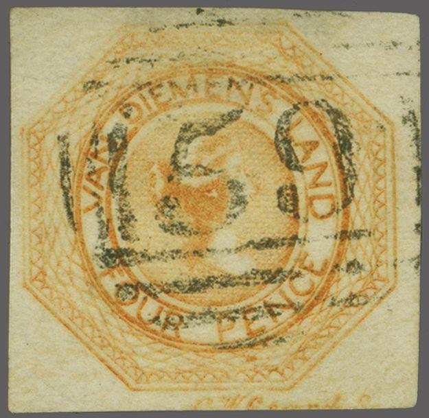 1854: 4 d. yellowish orange, plate II, worn impression, a used example with large even margins all round showing trace of C.W. Coard imprint at base, lightly cancelled by "59" numeral obliterator of Launceston in black. A fine and scarce stamp Gi = £ 375+