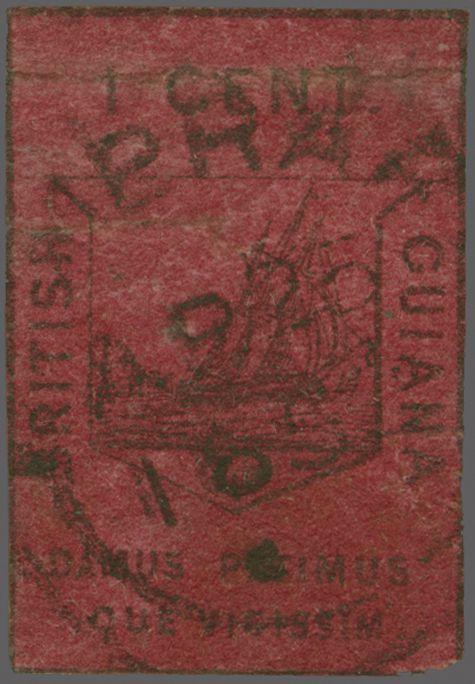 1852 (Jan 1): Lithographed by Waterlow 1 c. black on magenta, a used example cancelled by DEMERARA circular datestamp (April 25) in black, the stamp with horizontal crease, pinholes, repair and with corner imperfection at right Gi = £ 6'500