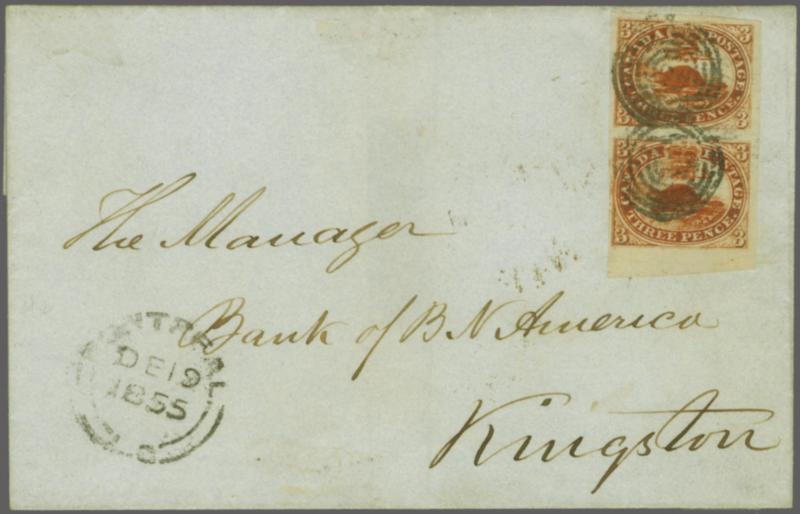 1852/57: 3 d. brown-red on wove paper, vertical pair with good to large margins including ca. 3-5 mm sheet margin at foot, tied by 7-ring target to folded cover from Montreal (19 Dec) to Kingston, with double split-ring arrival backstamp (21 Dec), a scarce and very fine franking. Certificate BPA (20