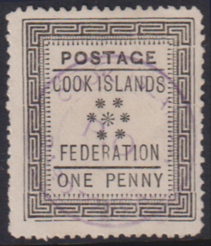 Cook Isl 1892 1d Federation, Cook Isl PO (etc) circular undated pmk in violet. SG 1. Cat £28. FU.