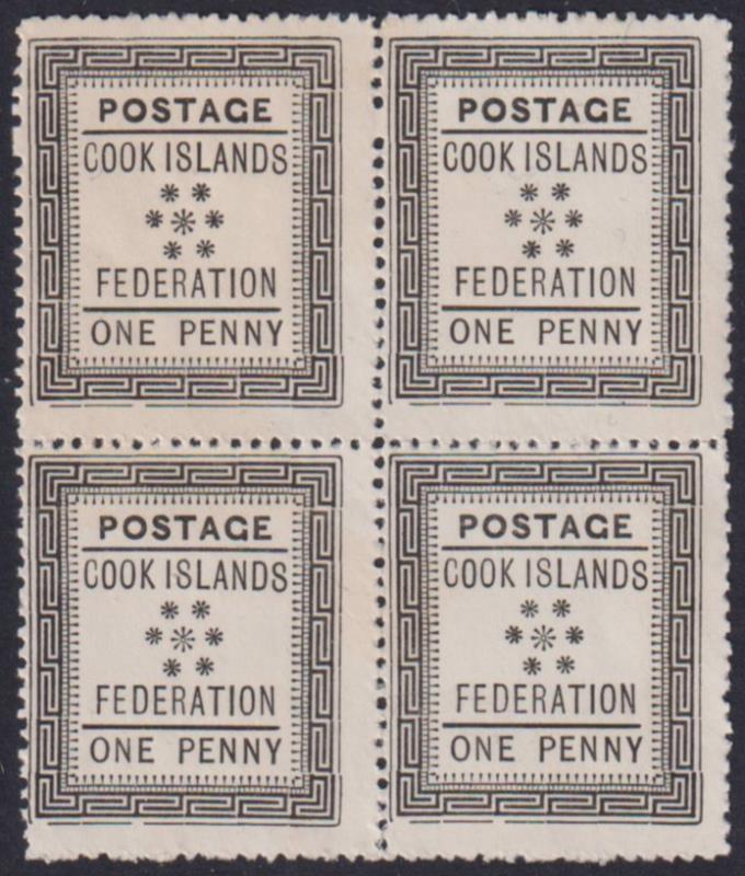 Cook Isl 1892 1d Federation block of 4. SG 1 Cat £150+. Mint no gum.