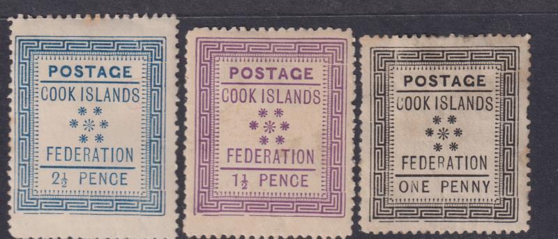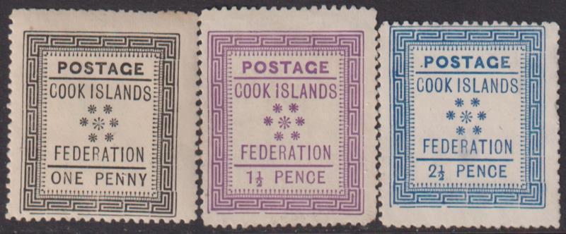 Cook Isl 1892 1d, 1½d, 2½d Federation, minor faults. SG 1-3. Cat £143. Mint (1½d, 2½d no gum).