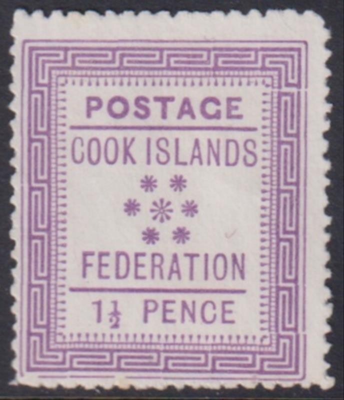 Cook Isl 1892 1½d Federation. Light back thins. SG 2. Cat £50. Unused no gum.