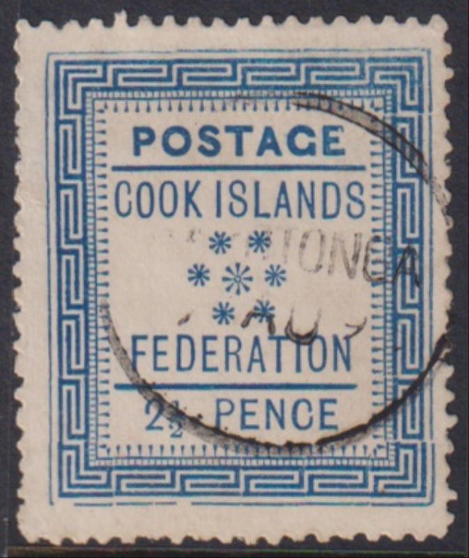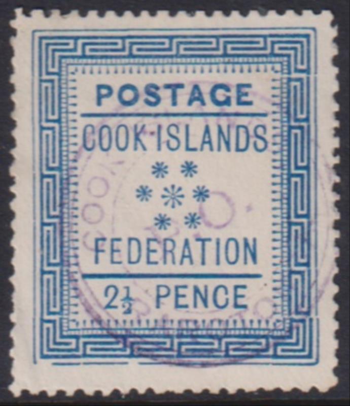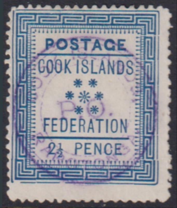 Cook Isl 1892 2½d Federation blue, p12½. O/c. Canc complete "COOK ISLANDS / RAROTONGA / P.O." h/s (violet). SG 3. Cat £40.