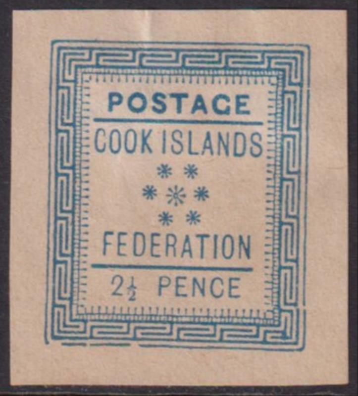 Cook Isl 1892 2½d Federation Fournier forgery, imperf with large margins, "Unused". "Fac-simile" diagonally printed on face. Small back thin & light creasing.