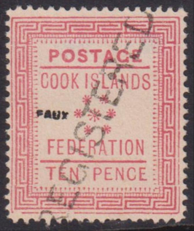 Cook Isl 1892 10d Federation Fournier forgery, perf - small "FAUX" h/s & fake "REGISTERED" s/l cancel. Margins smaller than genuine. Two small back thins.