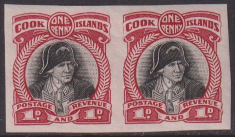 Cook Isl 1932 1d Capt Cook imperf plate proof horiz pair, issued colours, gummed unwmk paper.