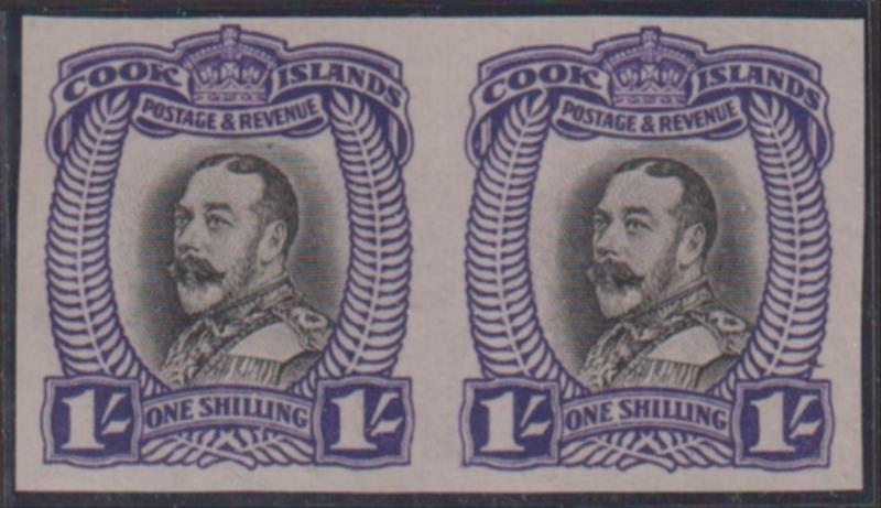 Cook Isl 1932 1/- GV imperf plate proofs horiz pair, in issued colours, ungummed unwmk paper.