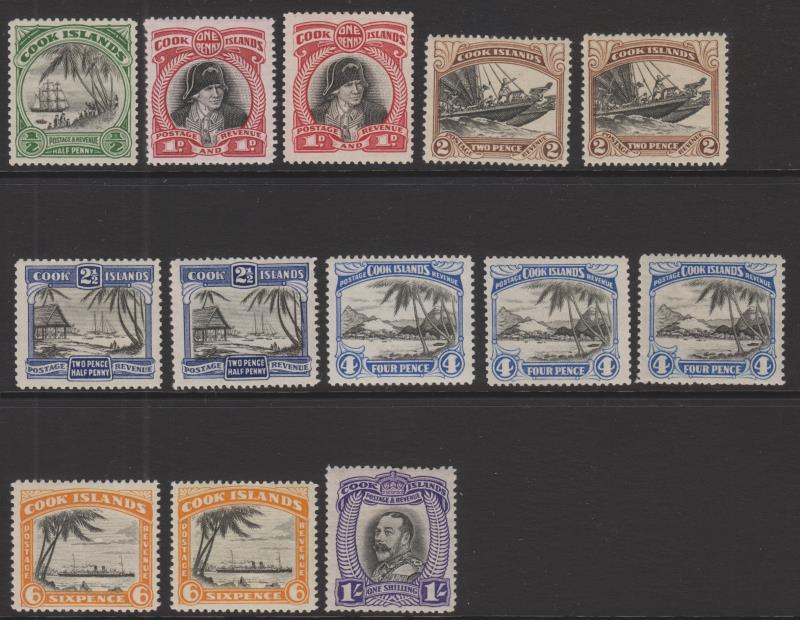 Cook Isl 1919 ½d-3d GV typo ovpt set of 5 (incl 1d Dom) & 2½d-1/- recess set of 8, p14 x 13½ & 7 p14 x 14½ (20). SG 47-59, 48a-55a. Cat approx £56. Mint.