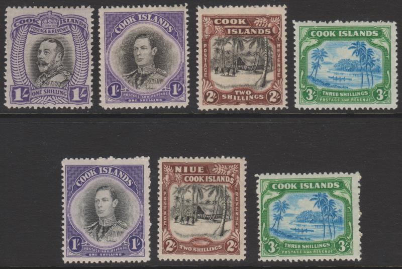 Cook Isl 1924 ½d-4d Picts set of 5 with NZ & star wmk. Also 1931 2d on 1½d, same wmk. SG 81-84, 94. Cat c£46. FU except 2½d is unused no gum.