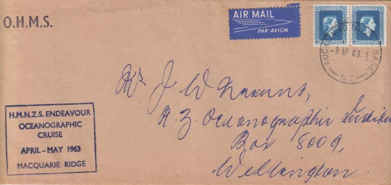 NZ 1963 OHMS HMNZS Endeavour / Oceanographic Cruise / April-May 1963 / Macquarie Ridge cacheted airmail cover to DSIR, Wellington-Auckland Naval Base & April cds on pair 4d Officials.
