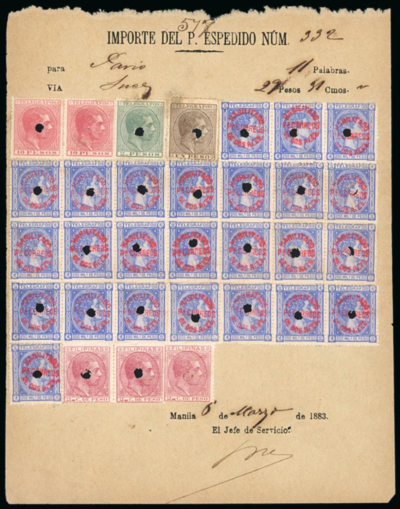 1883, Two official forms for telegrams via Suez to Paris and other to Haugesund (Norway) with mass frankings in combination postage stamps and telegraph stamps, all are security punched as usual, impressive & colourful.