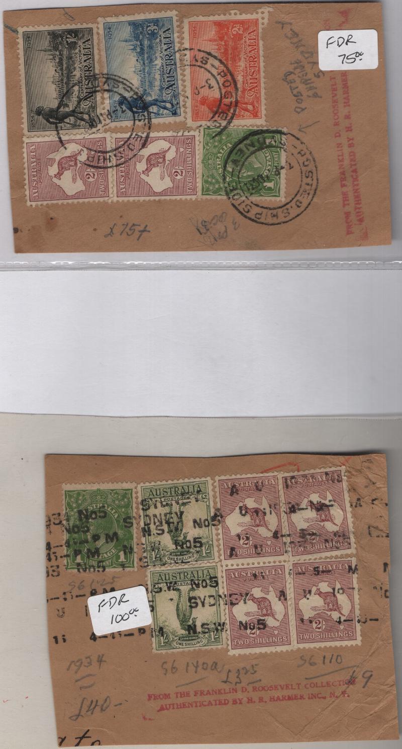 Abt (200) used on abt (50) cover pieces from 1930s, all marked as from FD Roosevelt collection, abt 70% Jamaica & 30% Australia; Jamaica incl some United Fruit Co & paquebot cancels; expect some flts; marked retail abt $1,865 (NV)