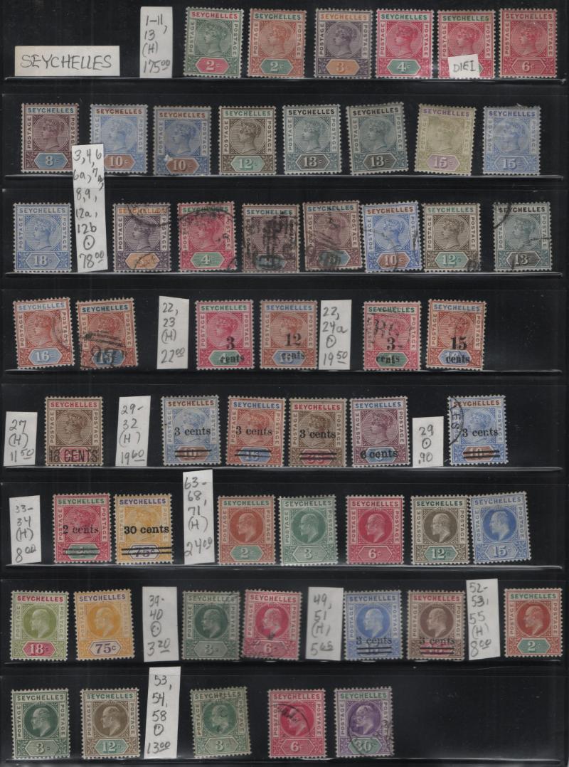 Collection (100s) */O all from Colonies in the Indian Ocean 19th Cent to the 1960s on Vario type stkpgs incl unused Seychelles #1-11, 111, 118-21, 125a-134a, 138, 142, 171, J1-8, Mauritius 8, 22, 112, 124 used, Ceylon 264-74, 278-88 & used 289, 289A, others, cond varies gen F-VF H