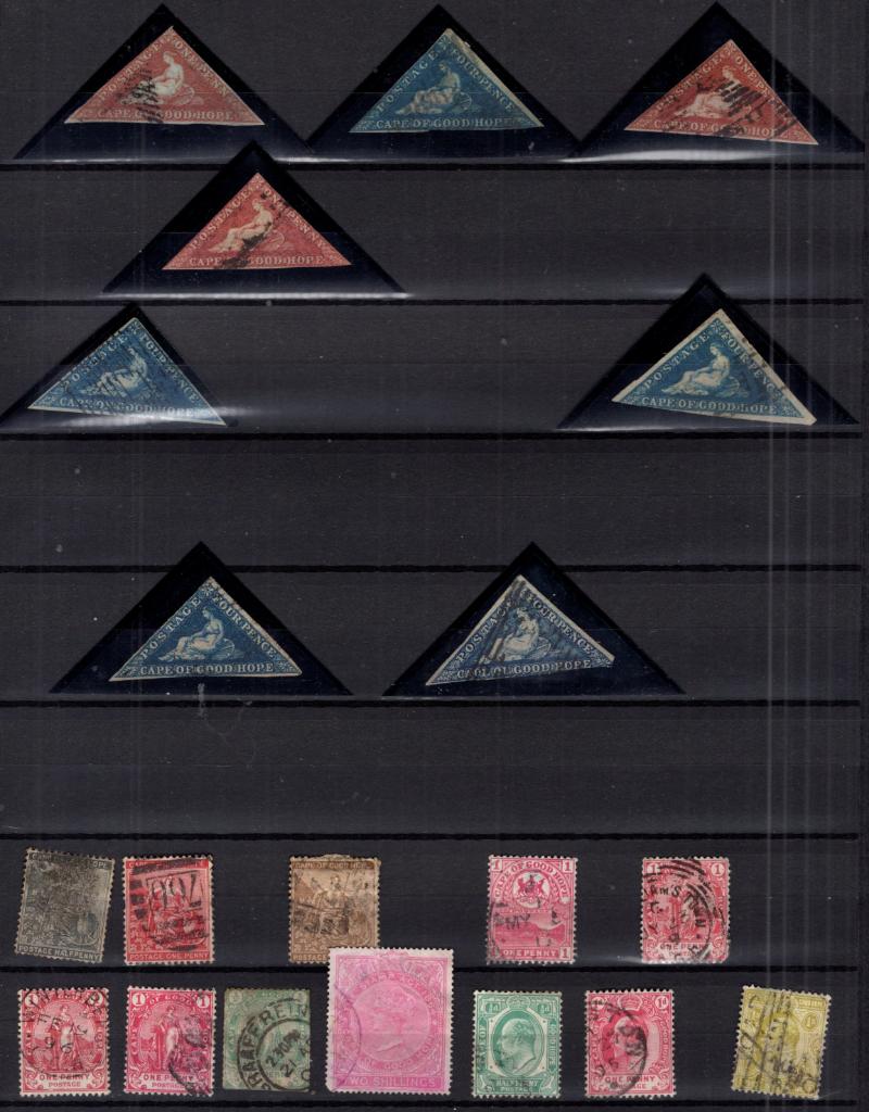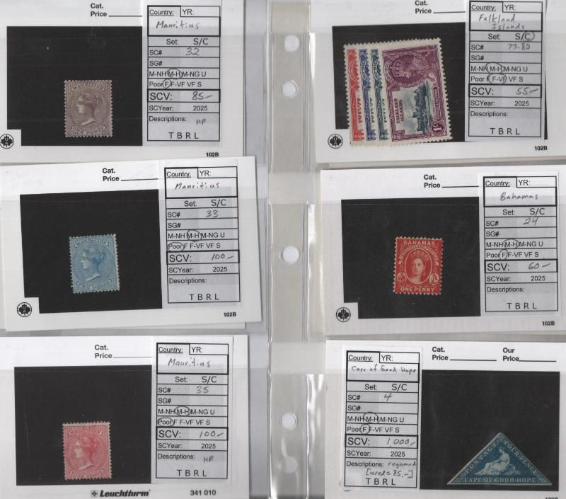 Over (30) better */O 19/20th Cent to 1940, high CV selection on cards incl used GB #2, 55, 139, 179 & unused 120, Cape of Good Hope 4, Bahamas 24, Cook Is 24, Falkland 77-80, Malta 134, Mauritius 10, 32, 33, 35, St Helena 122, S Africa 38, SWA C6, Turks Is 44 & others, mixed cond flts to F-V