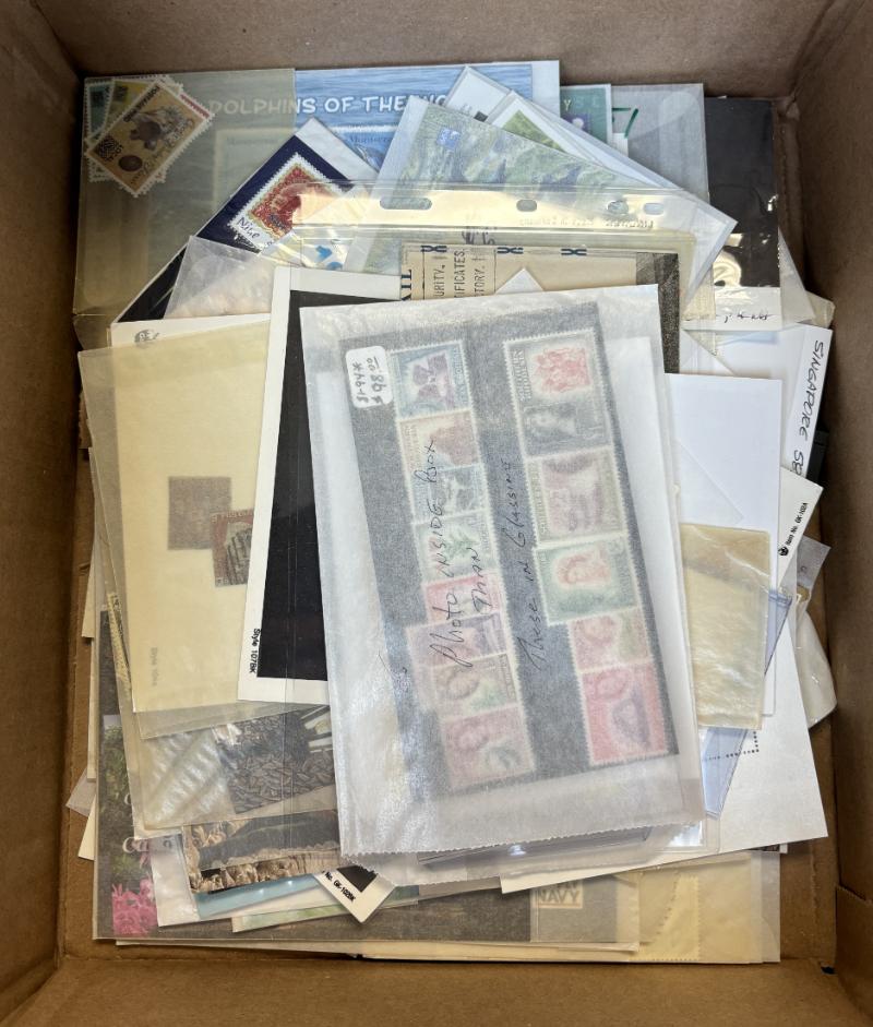 Accum (1000+) */O (7) diff countries, owner IDed & CV (NV), many cplt singles & sets, nice S/S & postcards incl China unused #508a, 784 (3), 784a, b (6), 1370-72, 1505-06, 1556-62, 1758-62 (3), 1812-16 (5), 1817-21 (4), 1864-68 (3) & (2) brown envs w/ (59) S/S CV $241, brown env w/ postcards