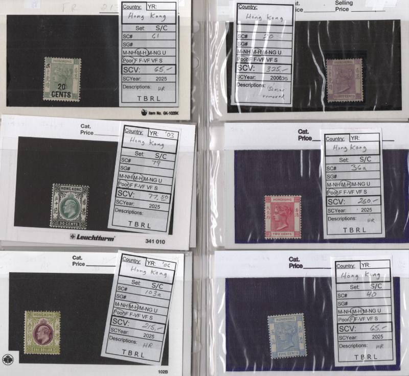 Unused Section (21) diff pre-1940 on cards comprises Hong Kong #20, 36a, 40, 43, 44, 47, 61, 79, 103a, 161, Ceylon 46a, 64, India 12, Labuan 86, 98, 110-18, Johor 65, J1-5, Pahang 15, North Borneo 147, J50-54, cond varies few small flts to most F-VF H