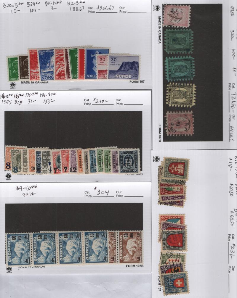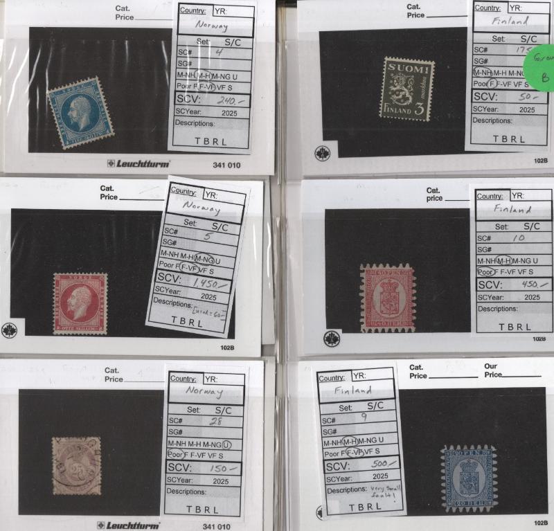 Mostly Unused Selection (25) diff better pre-1940 on cards Incl Finland #9-10 w/ Certs, 23, 40, 100, 175, Sweden 46, 47, 63, O19, O21, O23 & Norway 4, 5 (NG w/ Cert), 31, 38, 39b, 52, 57, 58, 100-03, 104-10 & Used: 28, cond varies flts to mainly F-VF H