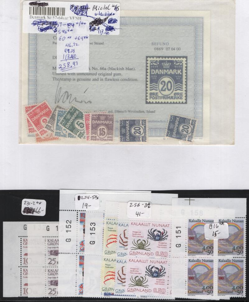 Accum (100s) */O (4) diff countries on pgs, owner IDed & CV (NV) w/ dup, incl Denmark unused #57-64 & 64a which is Michel #65, AFA 66a (Blackish Blue) w/ Cert, 409-10 (15), 544 (3), B49-52 (20), used #25, 25c, 26, 26b, 27, 29, 29b, 31, 31b, 32, 32a, 33, 33a, 33b, 34, 34b & others, Faroe Is u